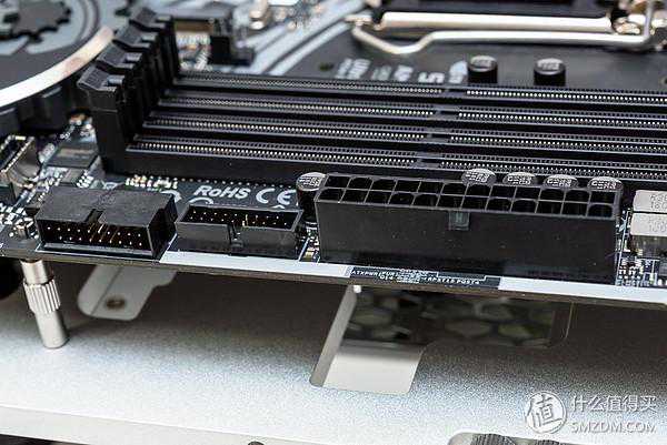 主板靠内存插槽一侧有一个24PIN供电接口+2个前置插座,其中一个插座为卧式设计。