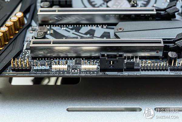 主板底部为一排扩展插槽,从芯片组这边一侧看起,图中从右到左,分别是SYSFAN、机箱前置控制插座、BIOS测试插座、BIOS清理插座、80debug灯、前置、前置(单接口4PIN)。单口的插座有些奇葩,这个接口是因为被无线蓝牙吃掉了一个,一般主板就直接不放了,因为现在机箱的线材都是2个一组。拿来连机箱内部的冷头灯组控制还行。