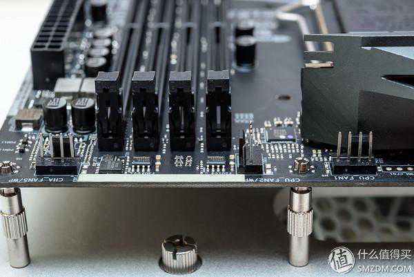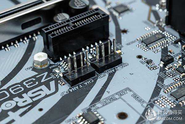 在内存插槽和SATA接口之间可以看到前置插座。旁边的ASM1074芯片是用于主板两个前置插座的通道。