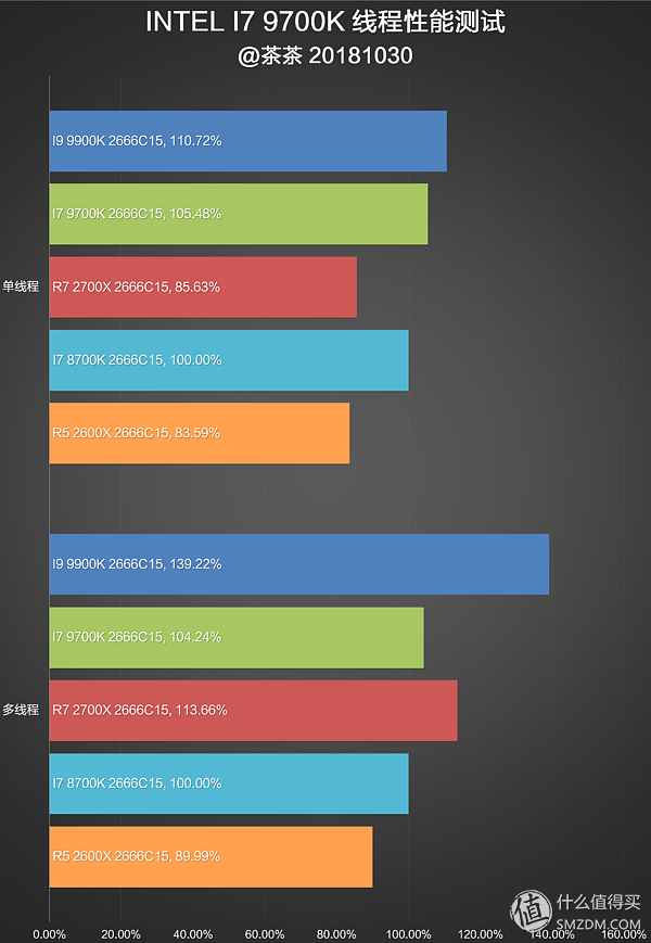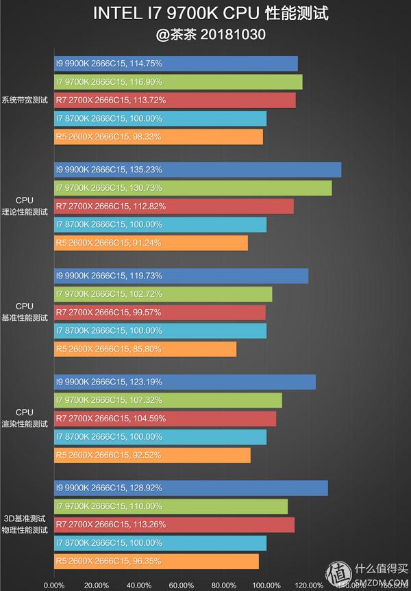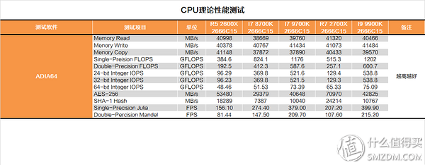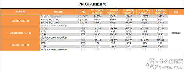 由于现在CPU的性能测试环境一直在动态变化(系统、bios、驱动),目前I99900K、I78700K和R72700X进行了全新的测试。R52600X的测试时间在2018年4月。