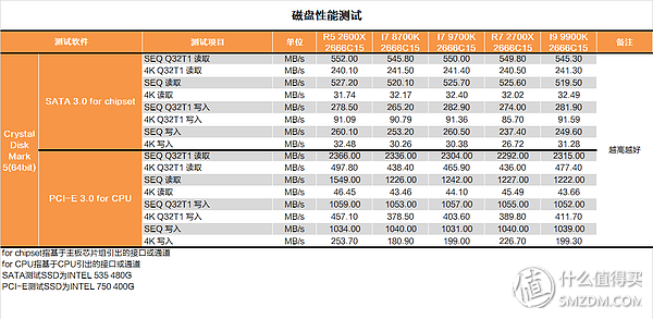 磁盘测试部分用的是CrystalDiskMark5,1G的数据文件跑9次,这样基本可以排除测试误差。测试的SSD分别是535480G和750400G,都是挂从盘。简单科普一下这个测试里的概念,SATA接口和PCI-E通道都是可以从CPU或芯片组引出的(看CPU厂商怎么设计)。这边为了统一,测试的都是芯片组引出的SATA和CPU引出的PCI-E。