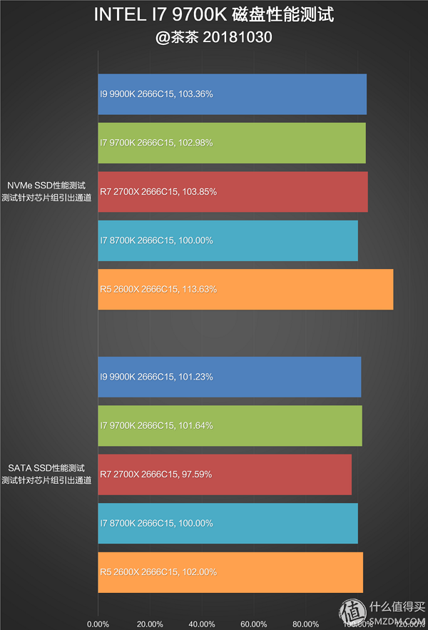 从测试结果上来看,I79700K与I99900K大致相当,R52600X在NVMe测试比较高主要是没有修复部分特定漏洞导致的,参考R72700X即可。