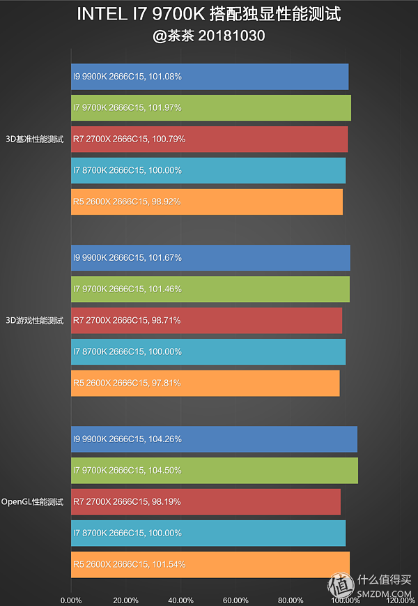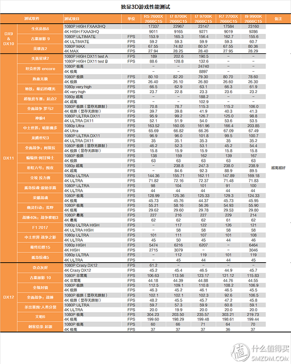 搭配独显的情况下,I79700K与I99900K相当接近,稳坐第一集团,只是相对来说CPU对游戏性能的影响真的不是很大,六核以上没有什么实质性差别。