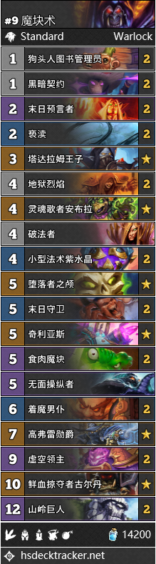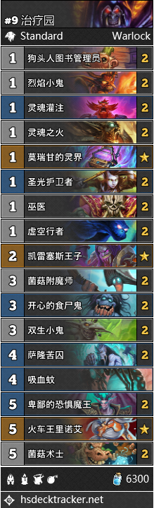 在5-传说分段,术士是使用率最高的职业,而治疗园是使用率第二高的卡组。这次的平衡补丁没有对术士的卡组和天梯表现造成直接的影响,仅仅是其他卡组的变化,带动了个别卡位的微调。比如发明家的消失,使血骑士和苔藓恐魔不再成为必要;而奥秘法的消失,也让偶数术可以考虑不需要再带两个不太好用的硬壳甲虫了。
