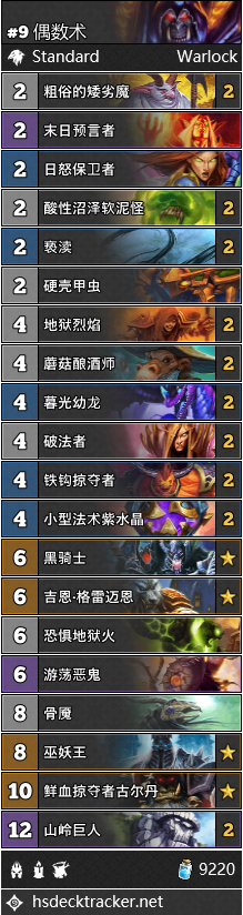 一般留牌:山岭巨人、暮光幼龙、粗俗的矮劣魔、末日守卫(对抗快攻)、游荡恶鬼/酸性沼泽软泥怪(针对)