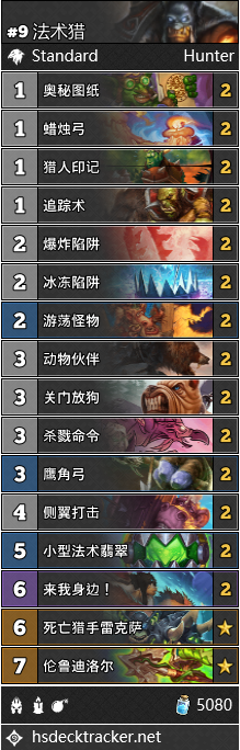任务贼挨刀之后最开心的无疑就是亡语猎了,解除了心头大患的雷克萨决定大展拳脚。虽然环境中几套快攻卡组依然对亡语猎有较大威胁,但依靠优化构筑可以减小这一劣势,比如满编130和阿古斯防御者,加强你的快攻抗性,同时德鲁伊的增多也给他提供了食粮。
