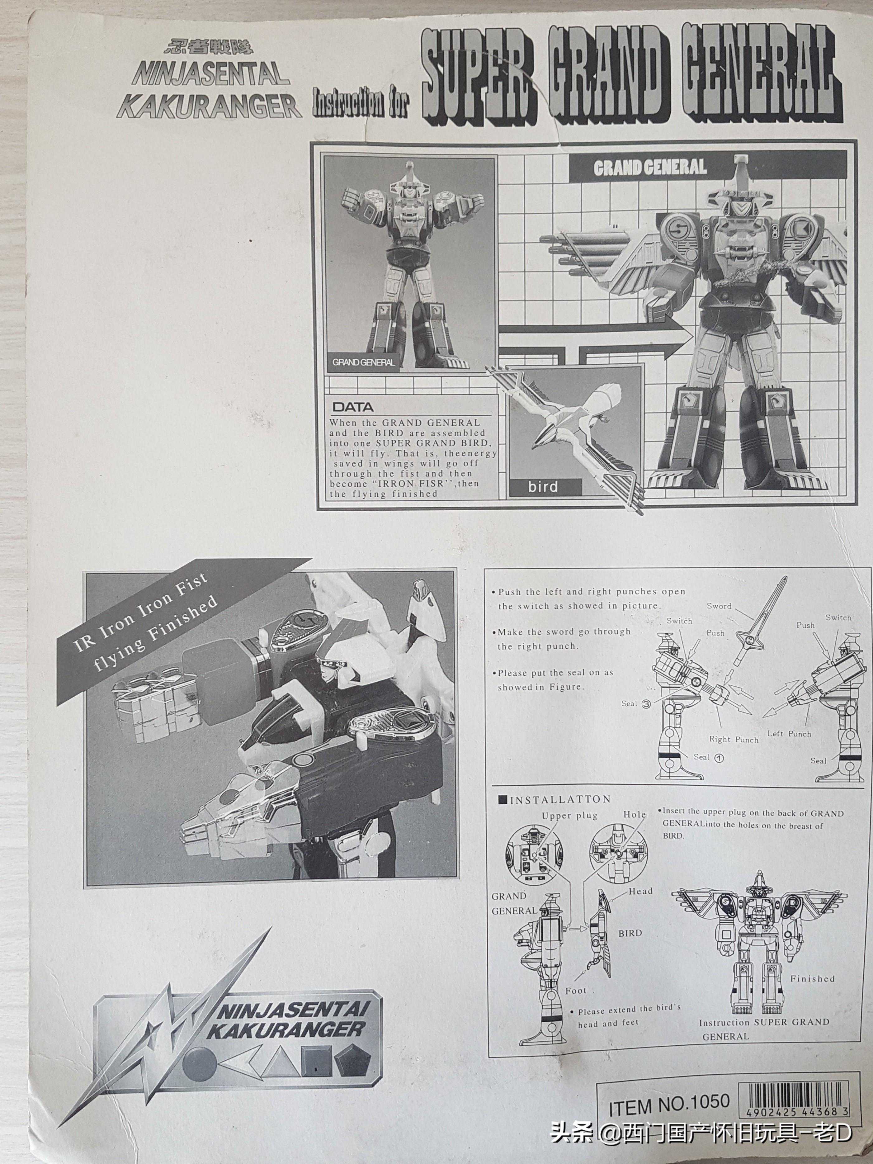 此款为忍者战队无敌将军的分体版本,机器人与上面无敌将军DX合体版本中的蓝色分体机器人是一样的,但是附带的翼丸却是STD比例的,因此无法完成合体(大小不同,合体卡口也不同)。DX的翼丸西门也搜索了一段时间,没有买到合适的。但是西门有单独买到一个带翼丸的忍大将军,将来有机会再补充发帖。