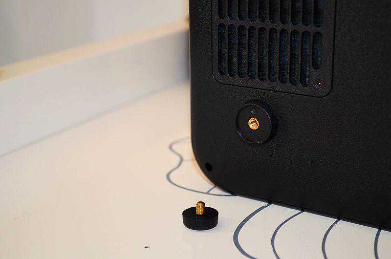 产品底部四个角各有一个防滑螺丝,而且这个螺丝是可以卸掉更换的,通过更换不同的螺丝,可以调整投影仪的高度。中间是一个螺纹孔,如果你家有三脚架,可以把酷乐视S3智能投影固定在三脚架上观看。