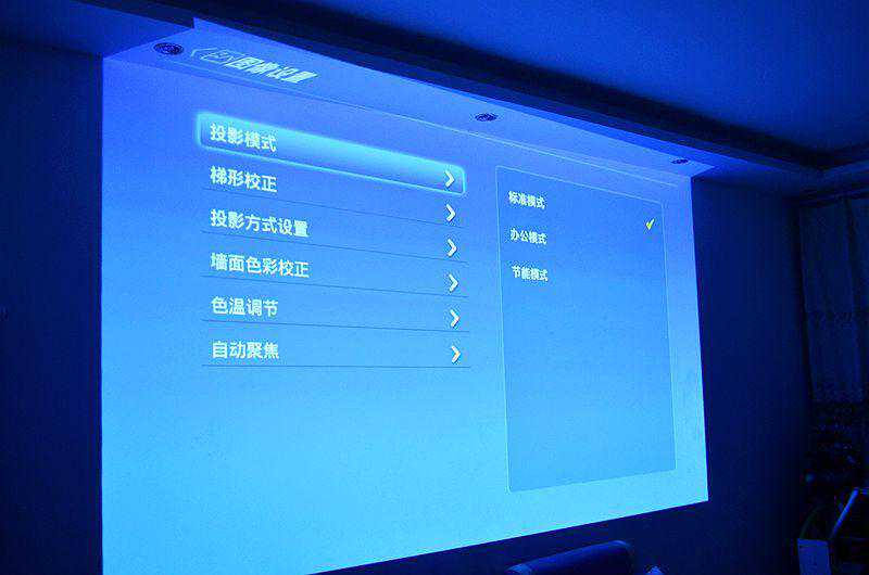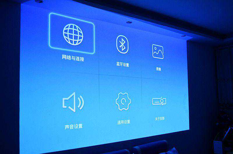 先来看些设置界面,大图标、大字体,非常的醒目。设置界面可以进行网络、蓝牙、声音等设置。在通用设置里面,可以对投影模式、梯形校正、投影方式进行设置。