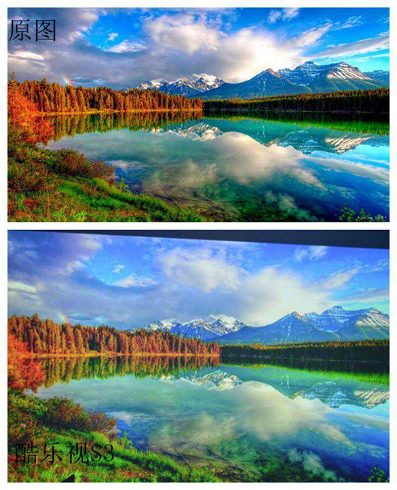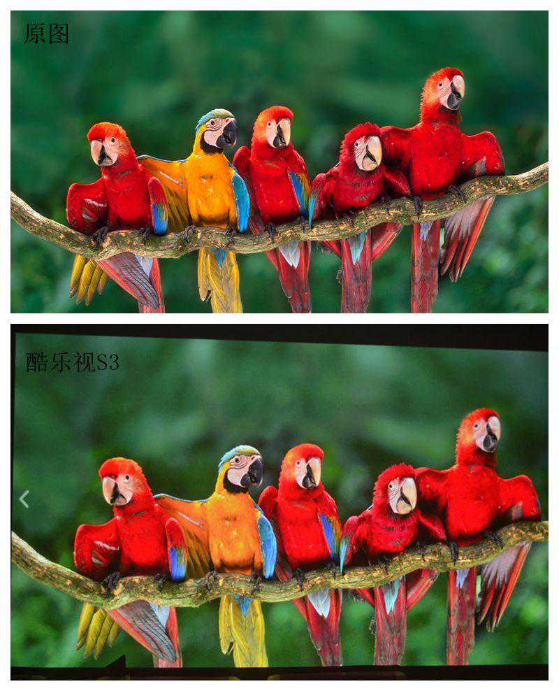 从画面来看,晚上的效果要出色不少,亮度足够,对比度给力,即使800p的分辨率,画面的表现也相对出彩,关键是长时间观看也不感觉眼睛不舒服。酷乐视S3智能投影的色彩还原度表现也相对出色。再来看下投影画面和原图的对比图。