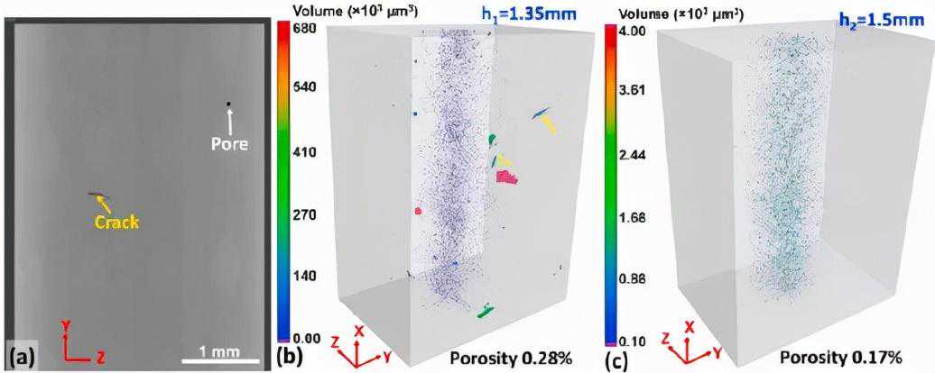 图2显示缺陷3D分布的CT切片和断层照片。(a)取自h1=1.35mm样品的典型CT截面;(b)h1=1.35mm和(c)h2=1.5mm样品中缺陷的3D分布。