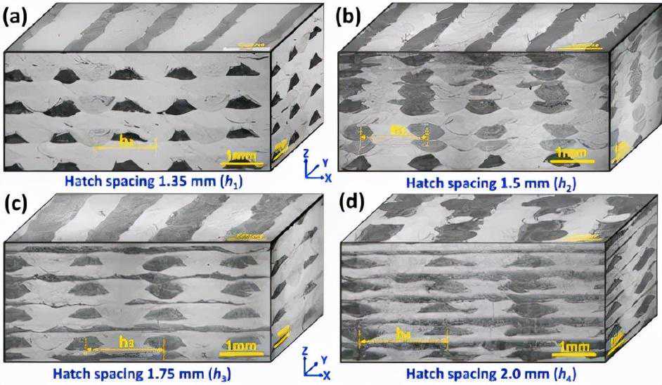 图3具有不同开口间距值的LAAM处理的SHM的3DOM形态(手动组合3D视图)。