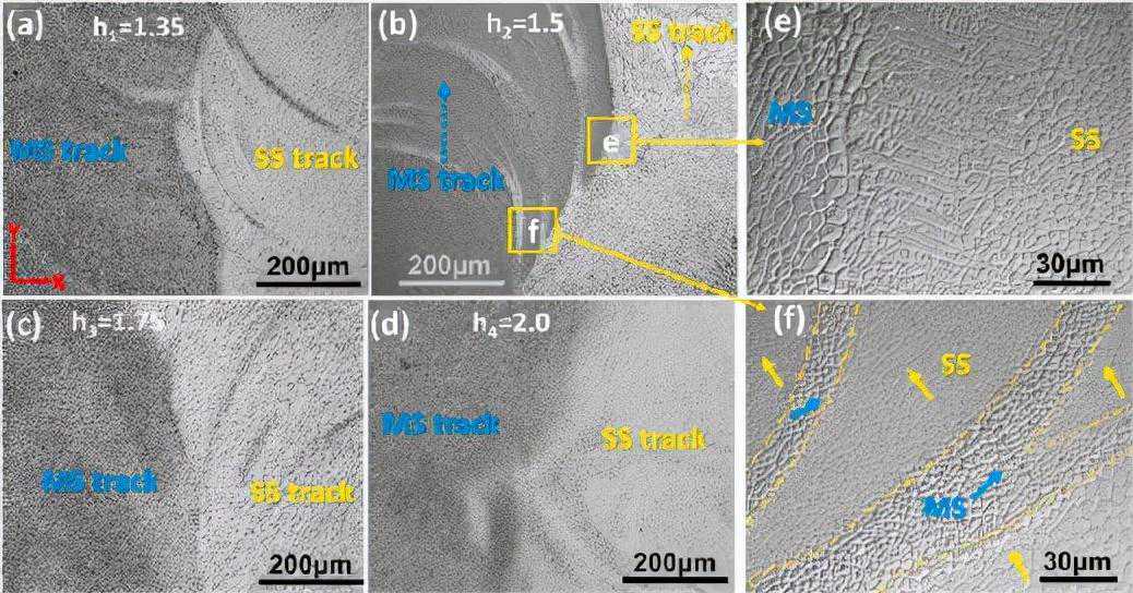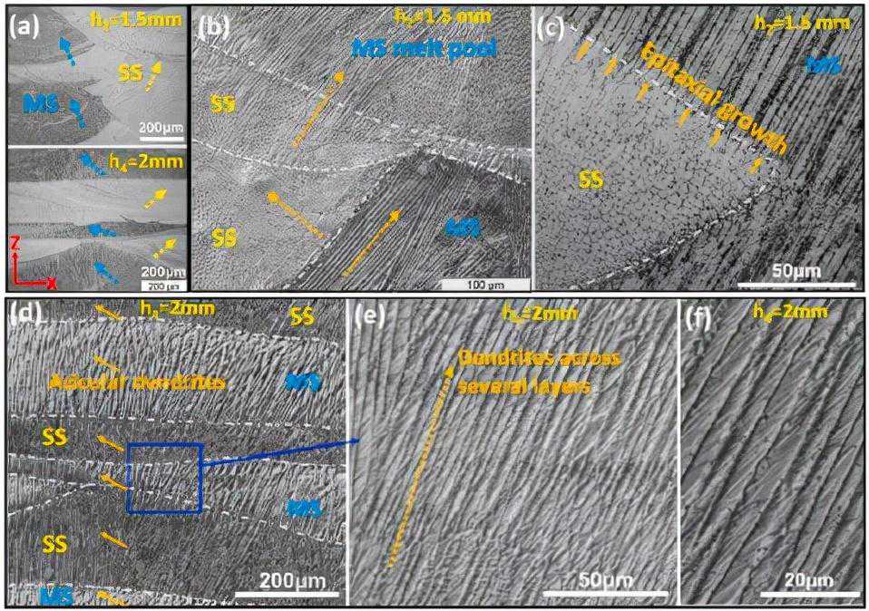 图5h2=1.5mm和h4=2mm加工的SHM的横截面(X-Z平面)微观结构比较。(a)显示两个样品不同形貌的低倍图像,以及显示(b)和(c)中的h2样品以及(d)至(f)中的h4样品的微观结构的放大图像。