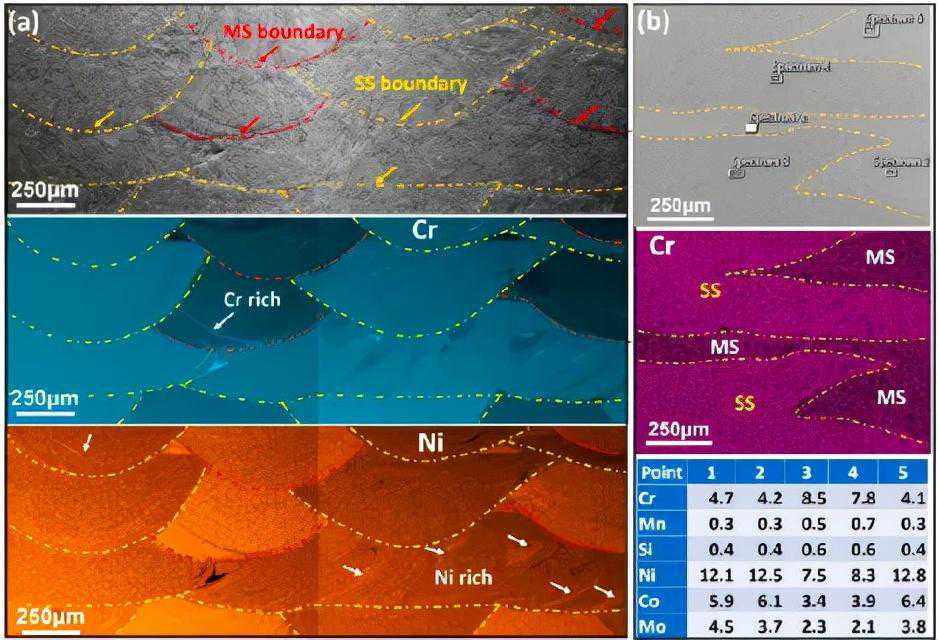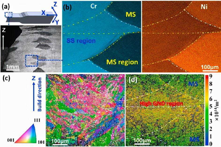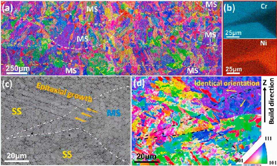 图7h2样品的EBSD分析。(a)对应于图6a区域的低倍率IPF和(b)SS和MS之间熔池边缘的EDS映射,(c)对应于(b)显示不同结构形态的带对比度图,以及(d)边缘的IPF。