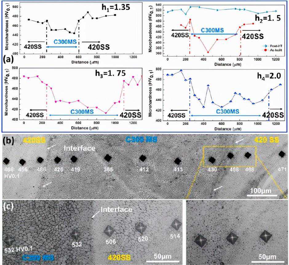 图8LAAM处理的SHM的硬度分布。(a)多个激光轨迹的硬度转变,以及显示(b)预制和(c)高温处理后条件下h2样品界面上的压痕的OM图像。