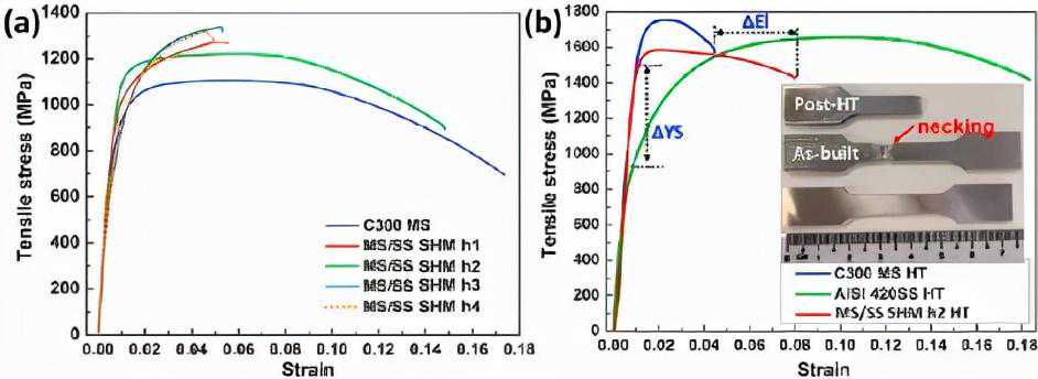 图9MS/SSSHM以及单片MS和SS样品的工程拉伸应力-应变曲线。(a)不同h值对SHM样品拉伸应力-应变的影响,和(b)AISI420、C300MS和h2SHM样品在HT后的拉伸应力-应变曲线(插入图为厚度为3mm的拉伸试样尺寸)。