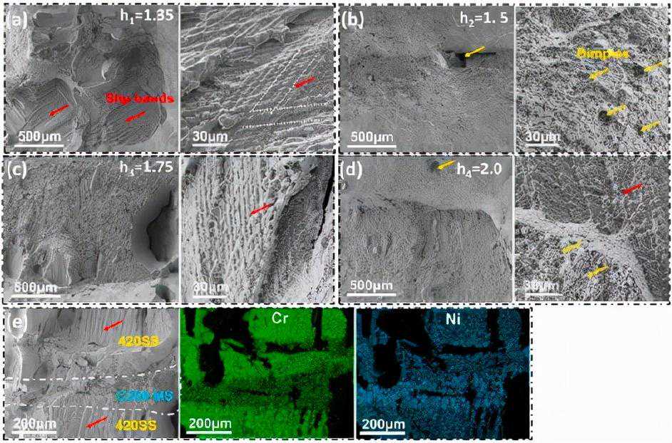图10拉伸试验后SHM样品的SEM断口分析。(a)到(d)分别用于h1到h4SHM样本,以及(e)在h3SHM样本上的EDS映射。