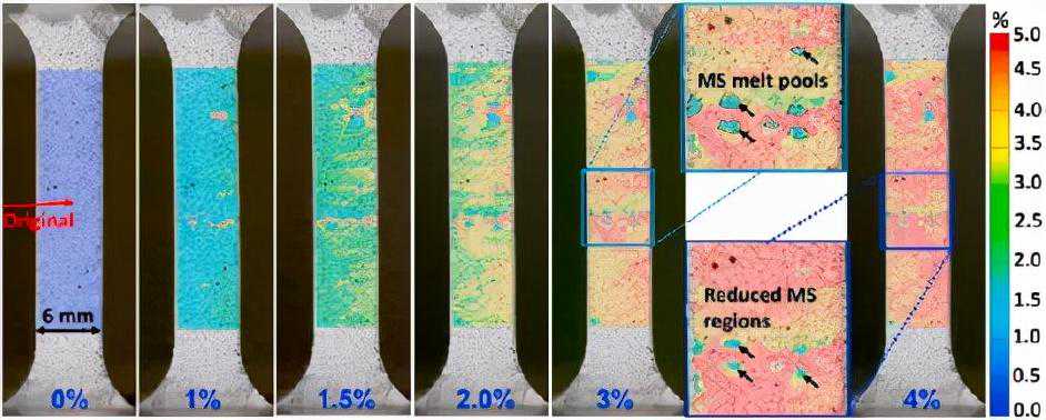 图11HTedh2SHM样品在拉伸试验期间的DIC应变图和变形行为。