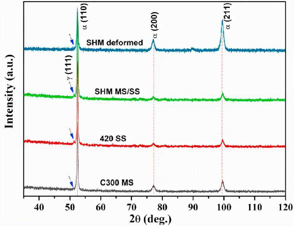 图13单片C300MS、420SS和MS/SSSHM拉伸试验前后的XRD图谱(使用Co靶材)。