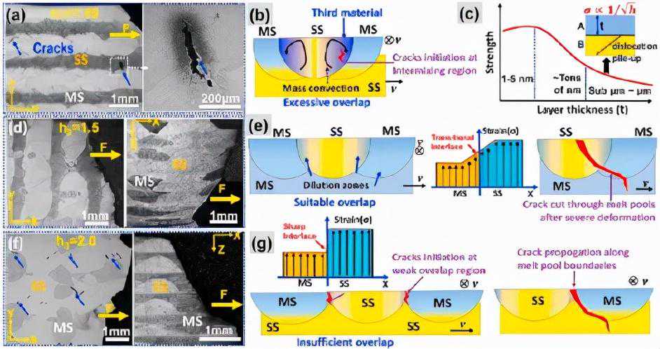 图15开口间距对断裂行为和断裂机制的影响。(a)和(b)h1=1.35mm样品,(c)多层金属中强度和层厚度之间关系的示意图,(d)和(e)h2=1.5mm样品,(f)和(g))h4=2.0mm样品。