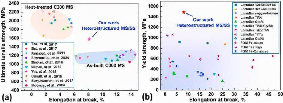 图16MS/SSSHM的机械性能与(a)AM处理的C300MS(预制和标准时效热处理)和(b)层状材料(420SS/304SS,301)的比较SS/420SS、铜青铜、Al/Ti、Ti/Al3Ti、Cu/Al、Ti/(SiCp/Al)、TiB2/TiAl、Ti/Ta、Cu/Ni)和功能梯度材料(FGM):FGM铁合金(MS-H13、MS-420SS、MS-304SS、316L-H13)、FGM钛合金、FGM钢-铜合金(MS-Cu和316L-CuSn10)。