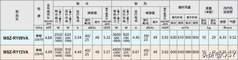 三菱电机RY系列,MSZ-RY09VA为1匹,MSZ-RY12VA为1.5匹