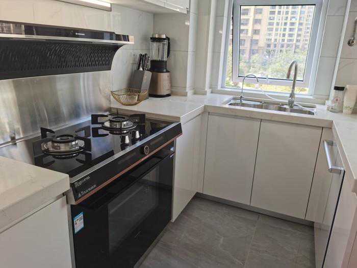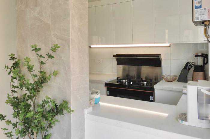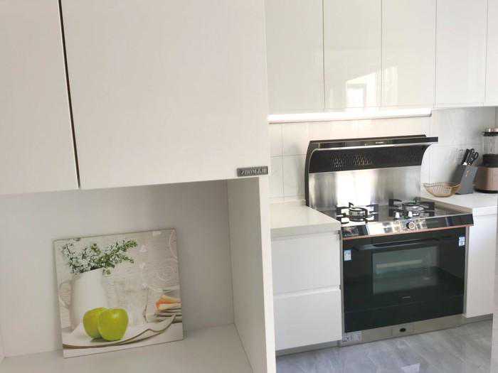 从图上可以看到,这位屋主家的厨房其实不大,靠墙四周都做了地柜,中间只剩下仅有两人宽的走道,这样的厨房如果做成传统的封闭式厨房,那效果是相当压抑的。于是,屋主拓宽思路,有心将厨房打造成开放式,以弥补厨房空间的先天不足。同时利用集成灶功能的高度集成属性,减少了厨房可见的厨电占位,从视觉上腾空厨房,让厨房看起来更加宽敞。按照这样的思路完工后,不仅厨房吊柜地柜可以用作收纳,就算将厨房用品储存于厨房之外的餐厅,拿取也并不算远。