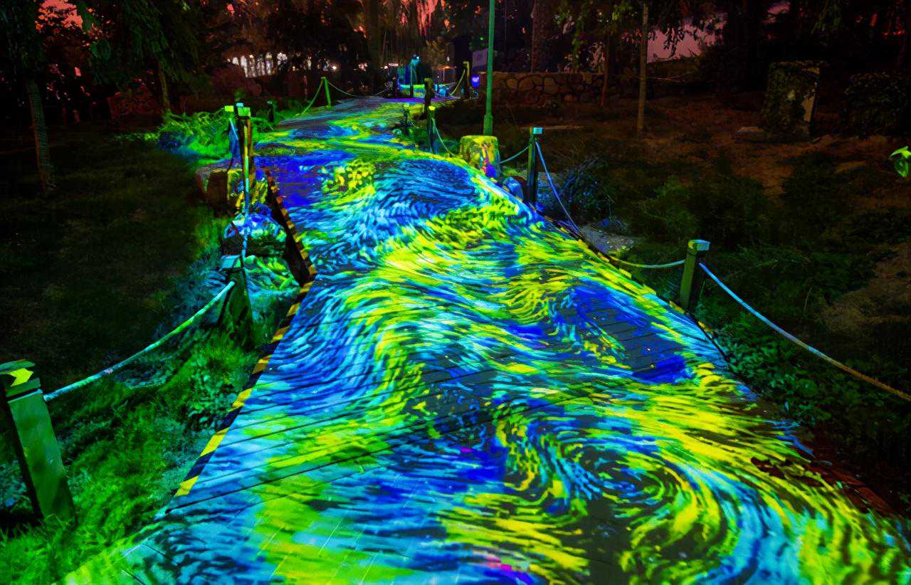 作为疫情后北京首个城市公园户外光影艺术沉浸式体验活动,“万物共生”结合国际前沿的科技手段,将光影与自然、虚拟与现实相结合,园区内利用大量的灯光影像设备,构建出一个神奇的景观世界,打造出独一无二的夜游体验。