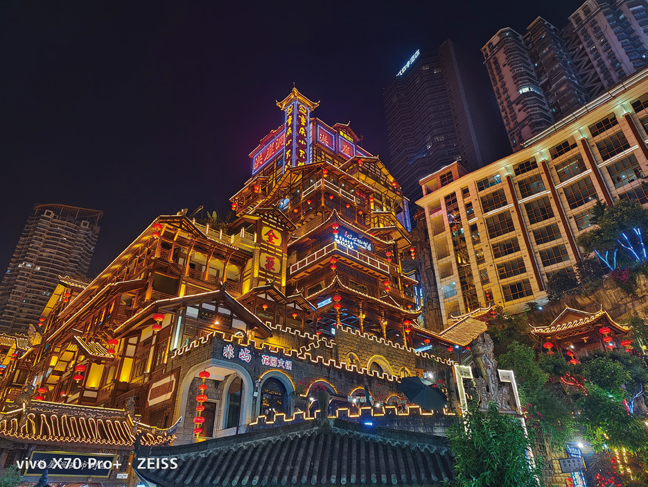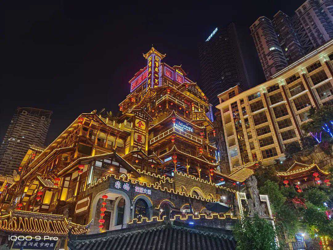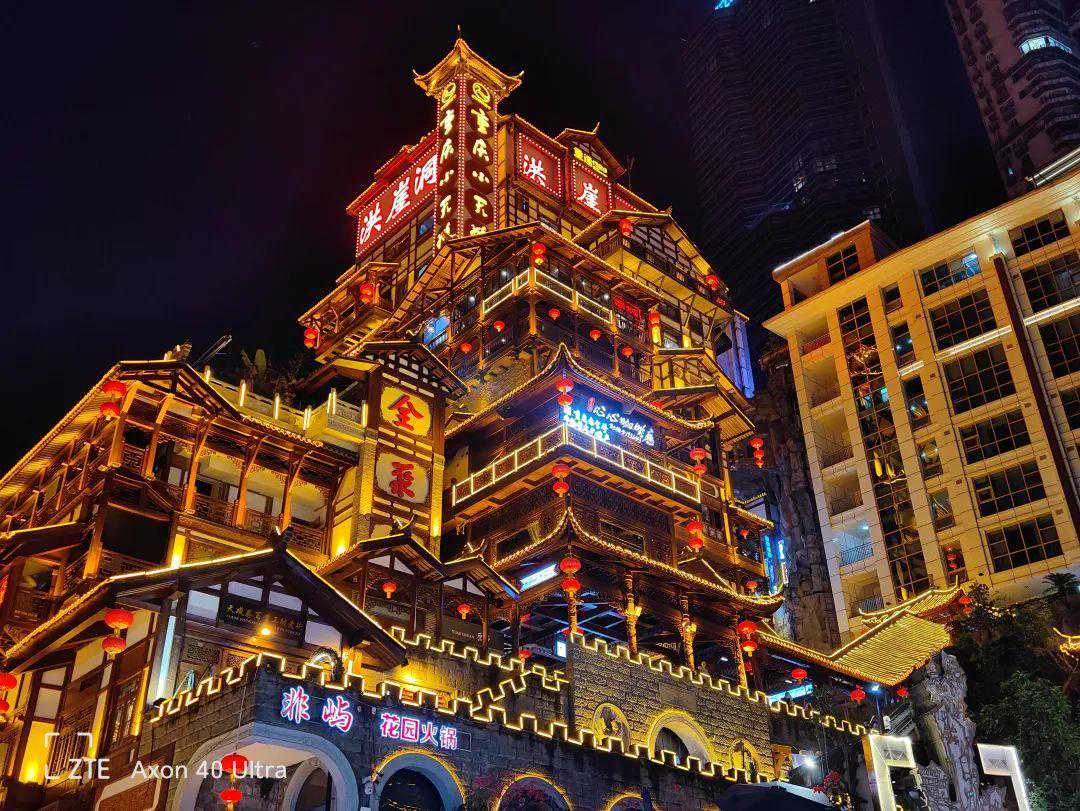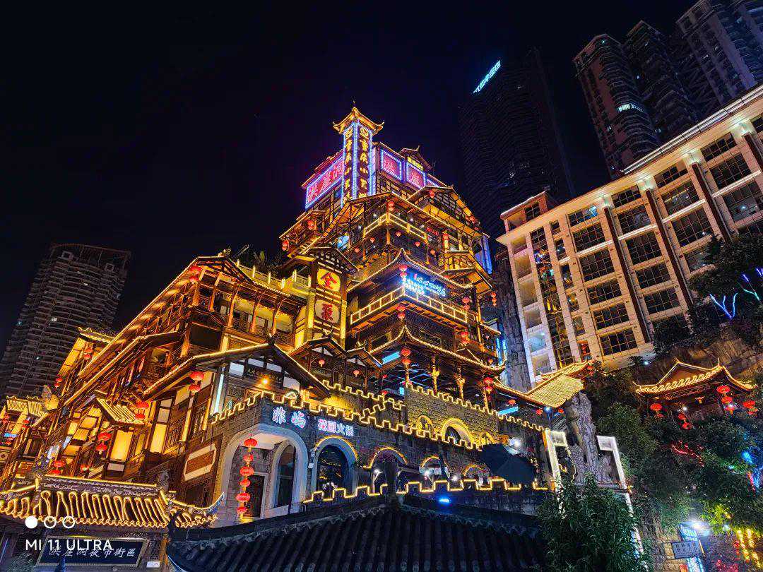 最后,终于到了夜景样张的对比环节,在这一年中,我们在太多发布会上听到了夜鹰、夜枭、夜X的算法,但到底它们的夜景表现如何呢,还是得实拍看一下。我们选择了重庆著名景点洪崖洞进行拍摄,这也是外地游客到重庆必来的景点之一。相较其他地方的夜景,复杂的木质建筑和多样的光线相当考验一款手机的拍照能力,接下来让我们看看这些手机在洪崖洞的考验下能够取得怎样的成绩吧。