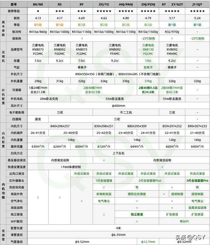 JY的配置:JY是改系列最新款,能效提升到5.24,具体配置还不确定,但根据了解,JY和JX配置基本相同,只是优化一些设计提升的能效。都使用同款9.2cc排量压缩机,制冷剂充注量大约为1000g,55w直流电机,冷凝器为2排共48根7mm铜管总长约42.7米,电子膨胀阀是不二工机。(JY配置为推断,未必准确)