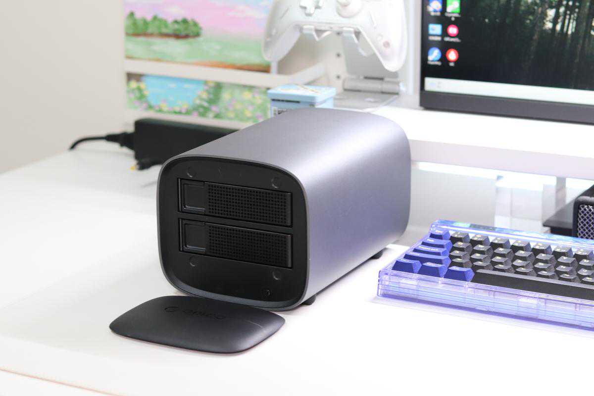正面的ORICO面板是磁吸式的设计,挡住了内部的硬盘仓,既美观又防尘;电源开关与硬盘状态灯就放置在面板的下方,一键开启也很简单。