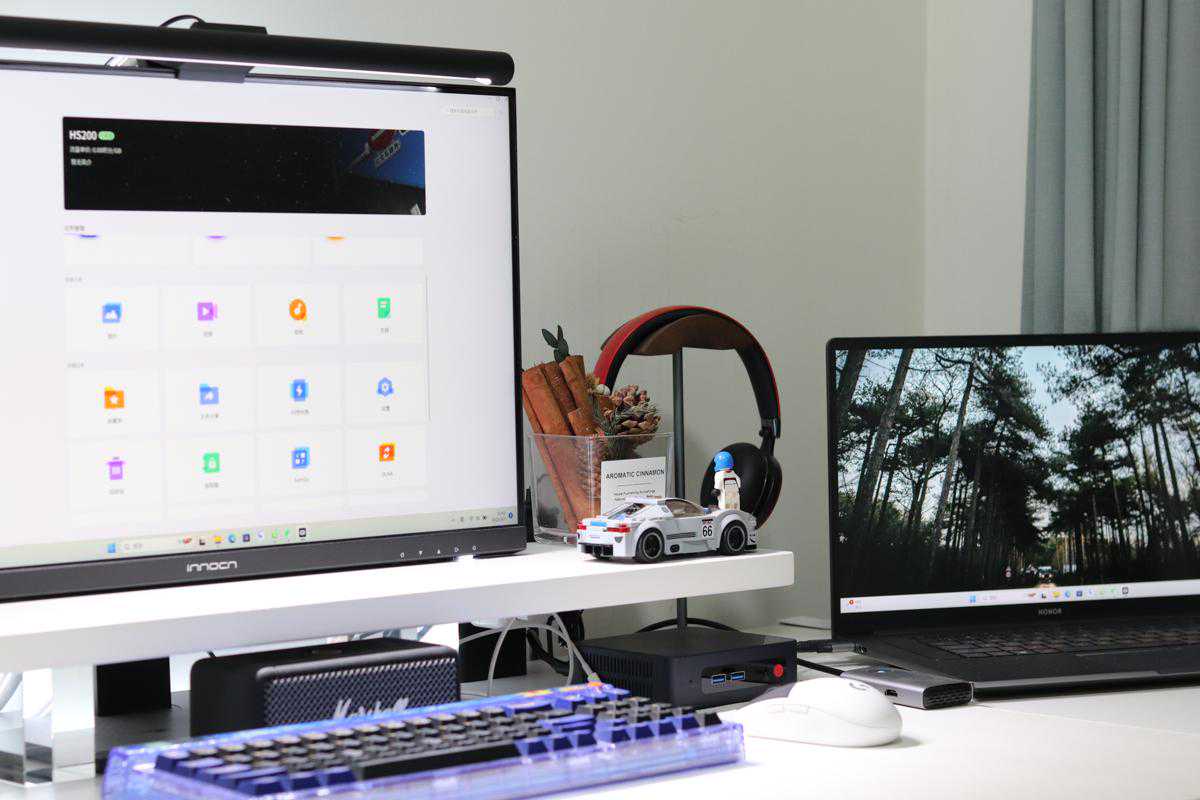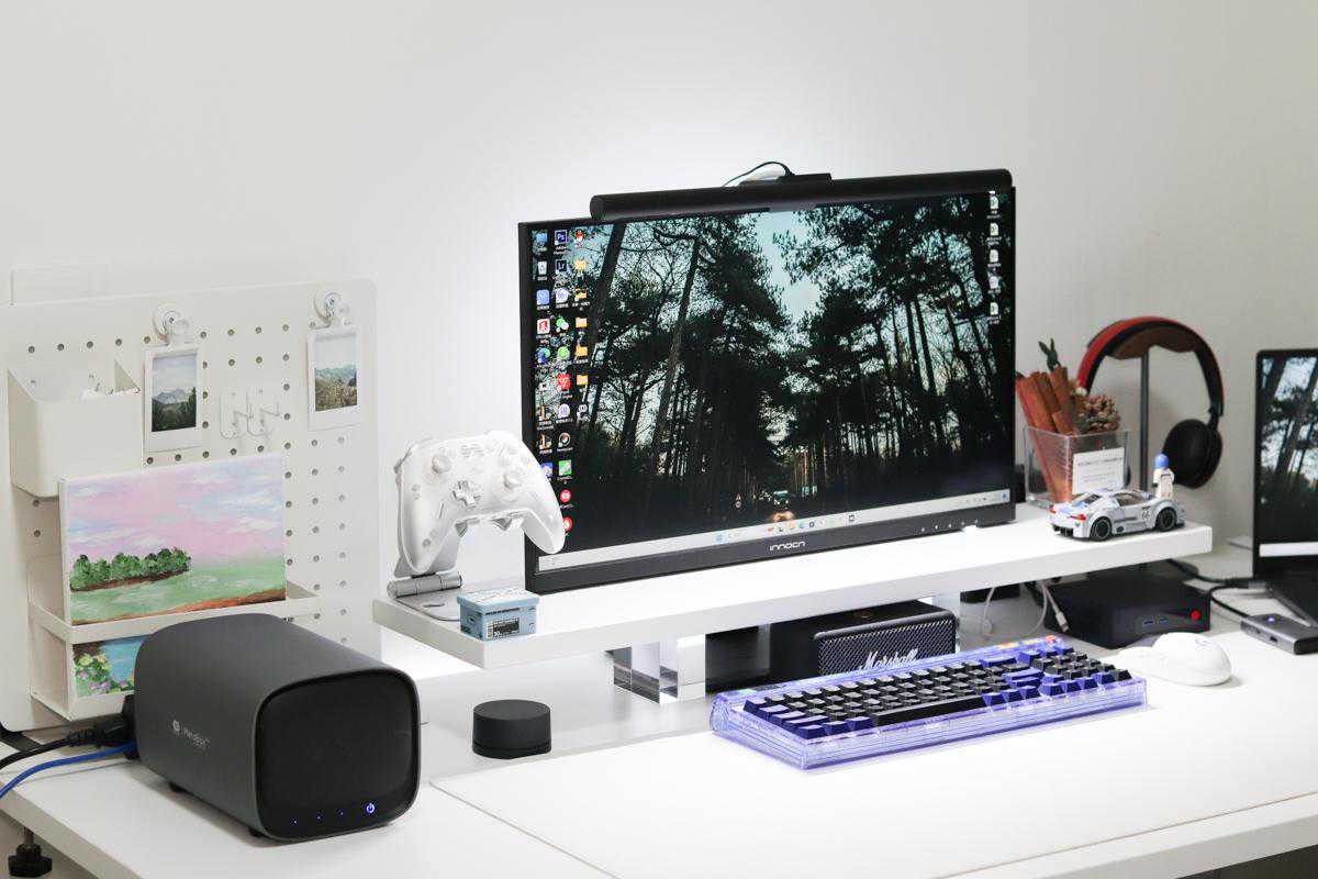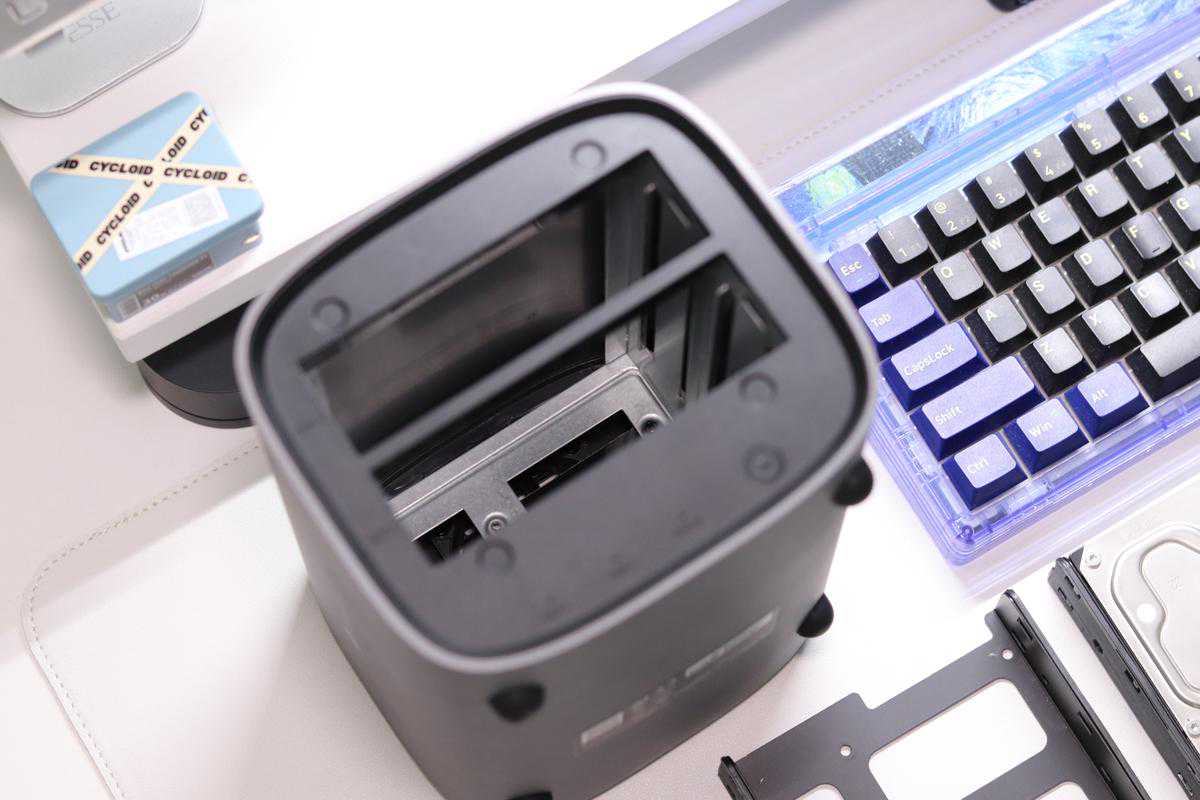 机身采用的是全铝合金一体成型设计,尤其是装上硬盘之后分量十足,并且深空灰的磨砂材质,摆在我这桌面上还是能够感受到十分有质感的,机身圆润,边角位置倒圆角处理不会有割手感。