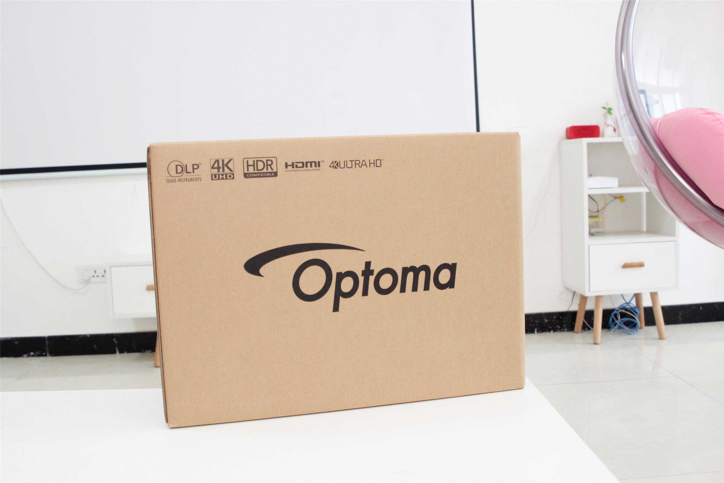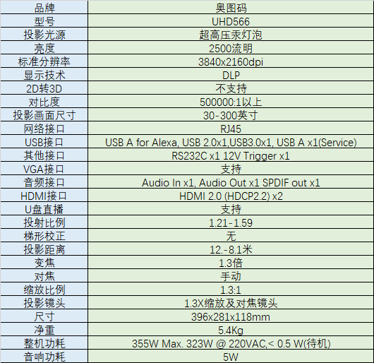 首先从包装上来说,奥图码UHD566的包装明显比一般投影仪大一圈,从另外一方面也说明了这款投影性能比较强大,从下图的参数可见一斑。