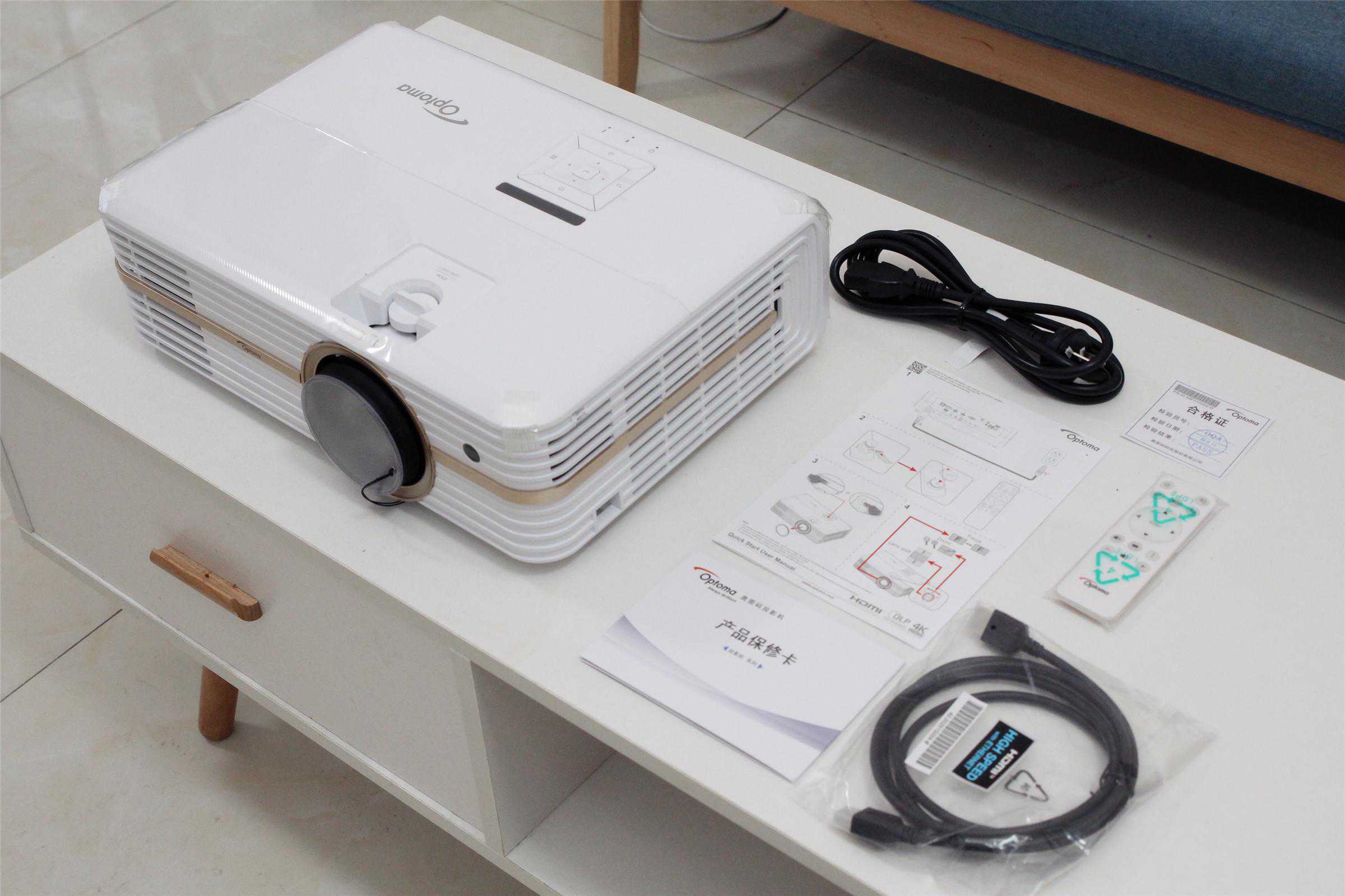 奥图码UHD566采用了白色外观设计,白色系也方便与不同的家居风格搭配。附件方面除了主机外,还有说明书、保修卡、合格证、HDMI线、电源线、遥控器。