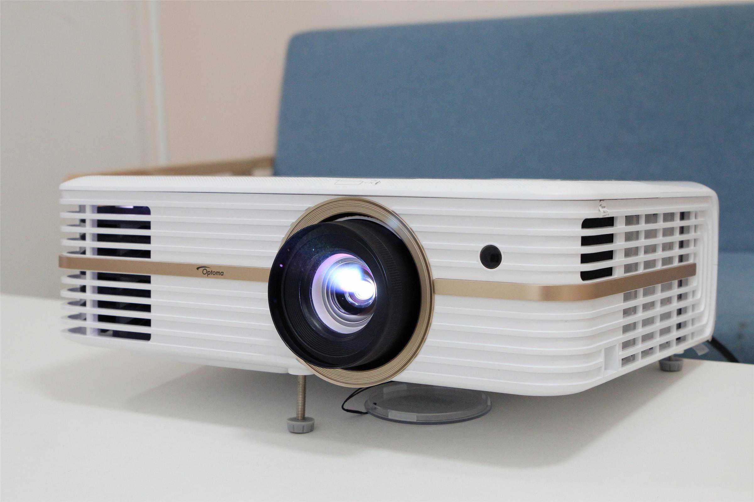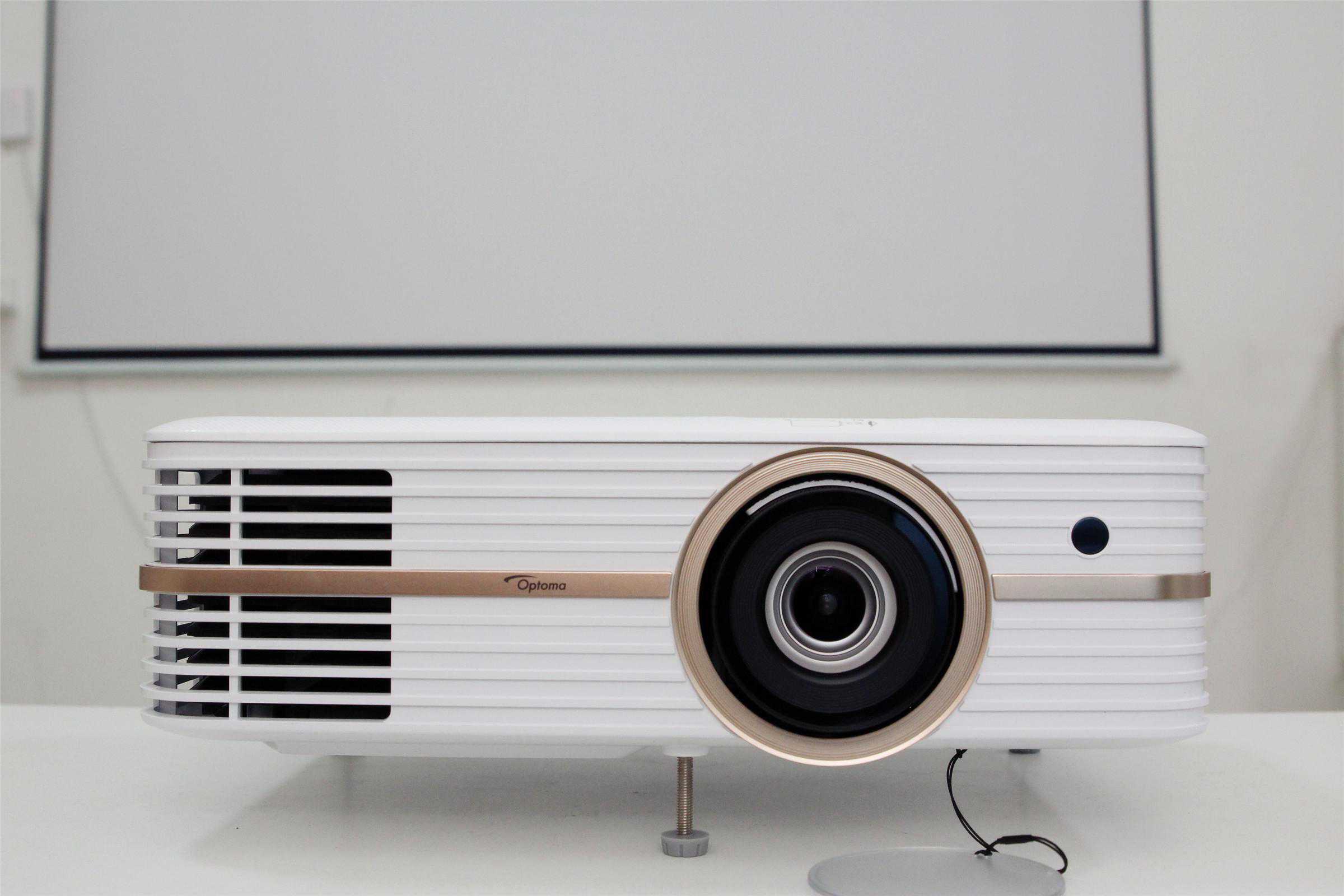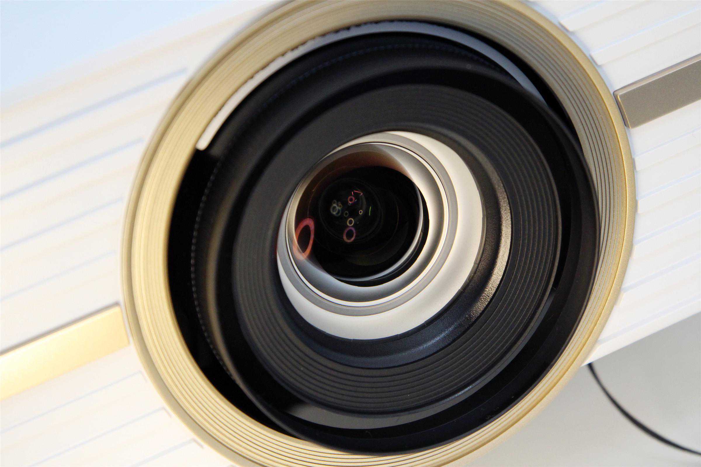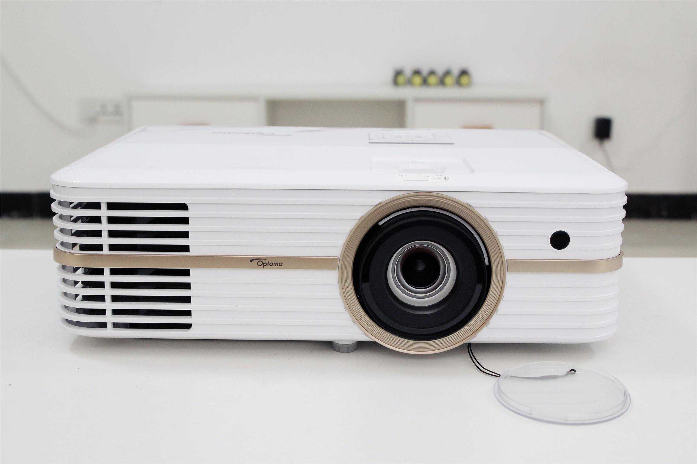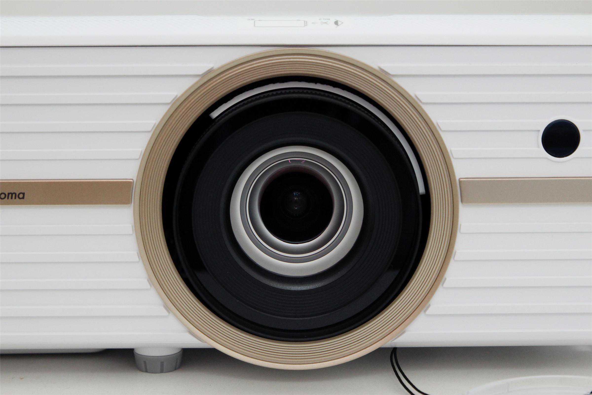 奥图码UHD566采用了主流的DLP显示技术,内置德州仪器0.47英寸的DMD芯片,分辨率3840×2160,亮度2500流明,对比度500000:1,显示色彩1073.4百万色(10bit)。投影光源为可更换式超高压汞灯泡,普通模式下使用寿命可达4000小时左右,节能模式能够达到10000小时。如果按每天8小时的使用时长,也能连续使用超过3年。从下图可以看出镜头采用多片式设计,光学素质不俗,内置2个5W扬声器在没有外接音箱的情况下,也能带来不错的音质,应付家用和部分商用完全足够。