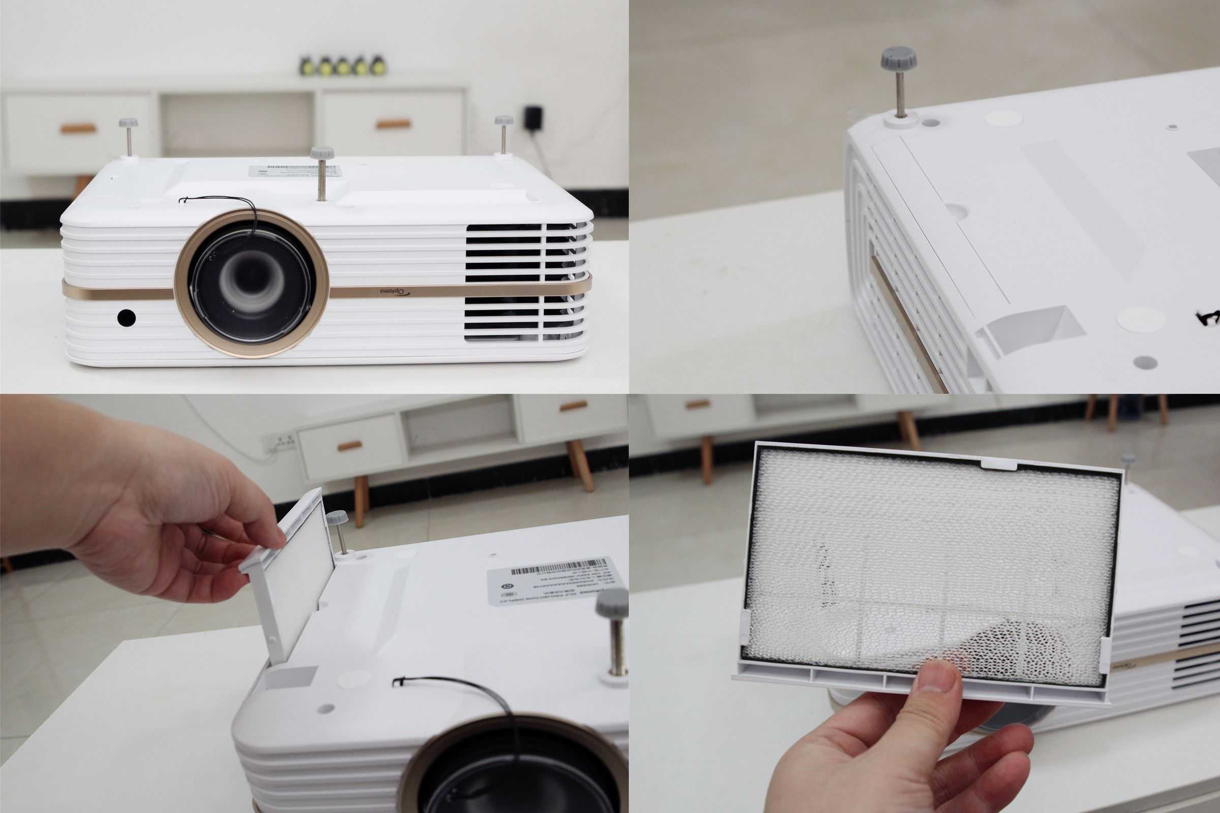 UHD566机身采用了方正造型,正面有一圈金色的线条,线条处有奥图码的LOGO,整体看上去时尚而不失典雅。两旁是大面积散热窗,四角处进行了圆润化处理,搬运时不会割手。