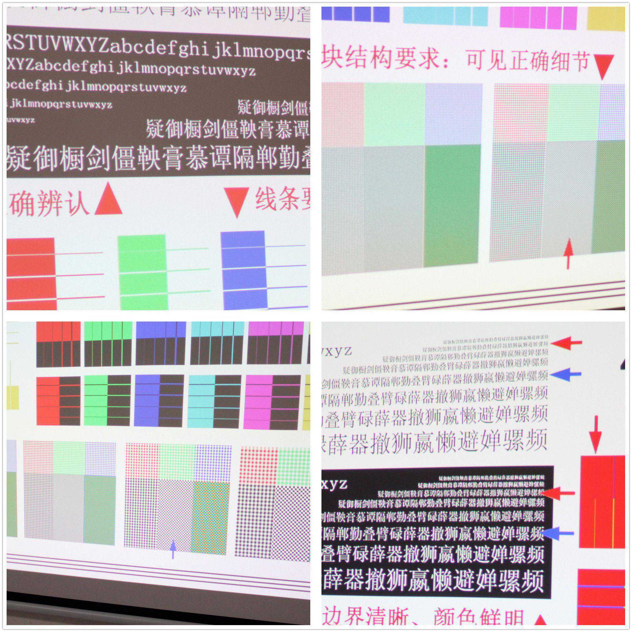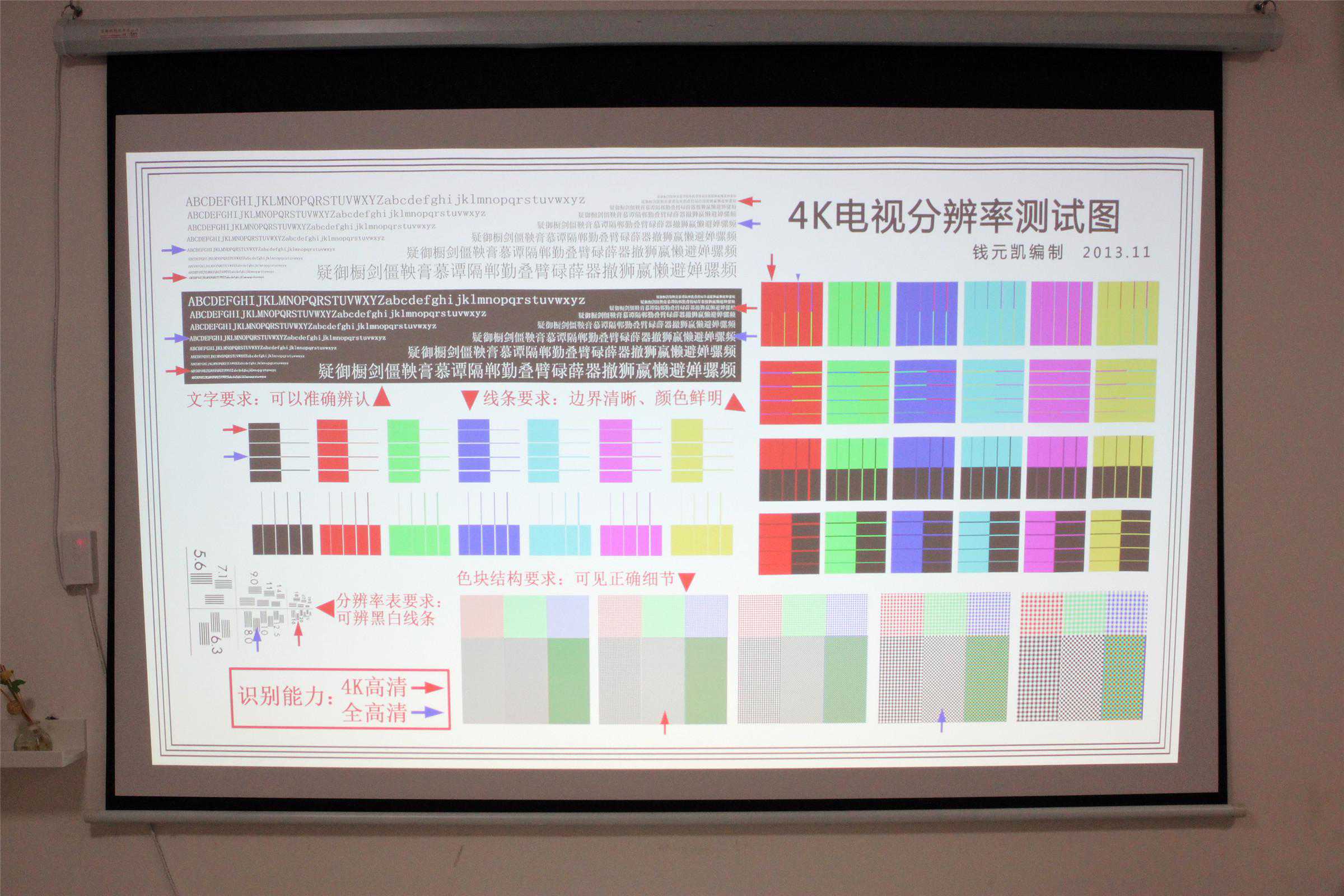 通过4K电视分辨率测试图可以看出,奥图码UHD566色块细节颗粒清晰可辨,文字边缘锐利,线条无变形,当然在黑暗的环境下表现更好!